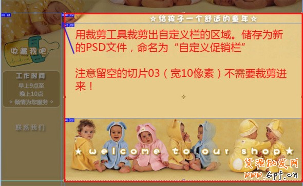 調整好圖片位置后先做些整體的設計,如加入店名、收藏我吧、工作時間等,也可以在適當的位置添加圖片,自我發揮吧。需要提醒的是,此步僅作靜態的設計,動畫設計等請不要在這步做出,待下面存儲為獨立的“店招”、“左側欄”和“自定義促銷欄”PSD文件后再編輯。