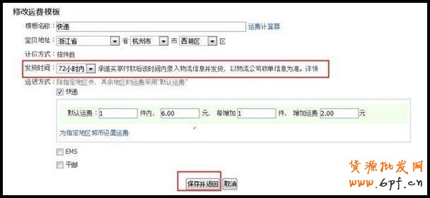 2) 在“發(fā)貨時(shí)間”選項(xiàng)合理設(shè)置發(fā)貨時(shí)間后,點(diǎn)擊“保存并返回”發(fā)貨時(shí)間設(shè)置即可啟用