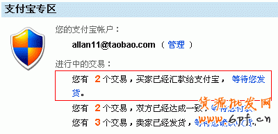 第一種方法,你可以在我的淘寶—“支付寶專區(qū)”中看到“您有×個交易,買家已經(jīng)匯款給支付寶,等待您發(fā)貨”。點擊“等待您發(fā)貨”那個鏈接即可。(如下圖)