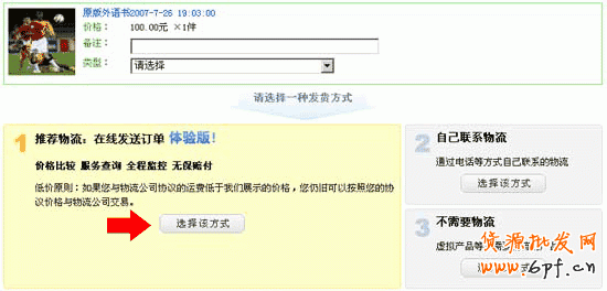 頁面的下半部分是三種選擇方式:推薦物流、自己聯(lián)系物流和不需要物流。首先以推薦物流為例,看看它的發(fā)貨過程。當(dāng)你的鼠標移動到推薦物流區(qū)域,此區(qū)域變成亮黃色,點擊這個區(qū)域中的“選擇該方式”按鈕(如下圖)