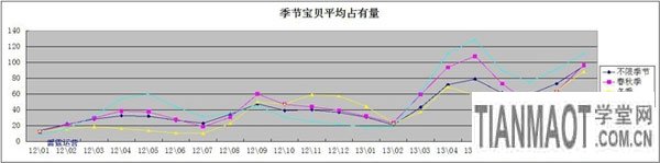 通過寶貝平均占有量發(fā)現(xiàn),在季節(jié)這個屬性里,競爭都差不多。因此,選擇產(chǎn)品的時候,可以考慮以冬季為主推款,附帶銷售春秋季的。