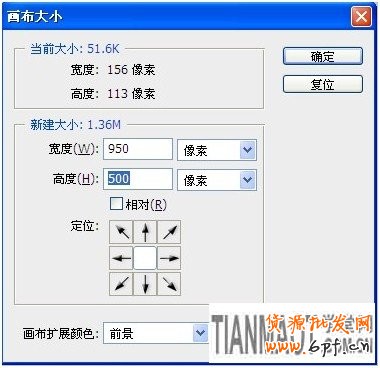 2、設置好寬度,注意單位是選擇像素!畫布的擴展顏色為前景!如下圖: