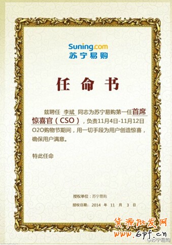 @蘇寧李斌 被委任為蘇寧易購第一任首席驚喜官(CSO),任期是11月4日-12日的O2O購物節期間,據說用戶的驚喜指數和激動程度是崗位考核的唯一KPI,他將放出什么大招呢?有沒有很期待呢?