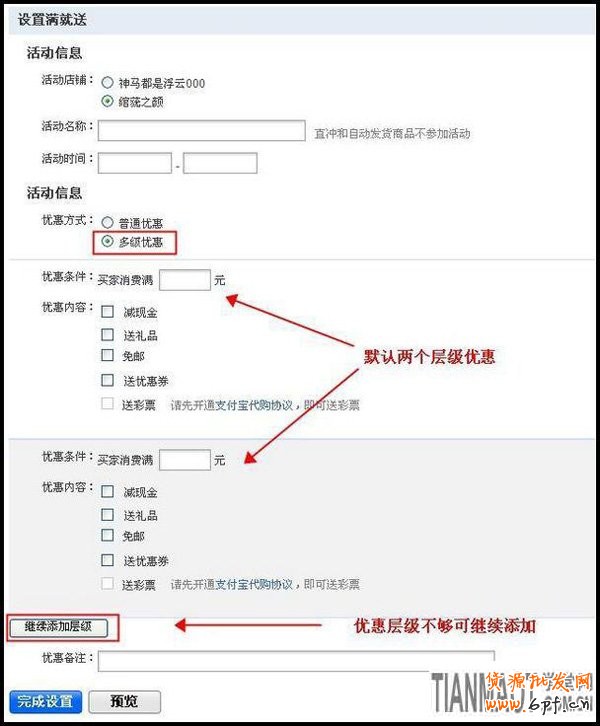 4、根據提示往下設置,可根據需求,設置多階梯促銷活動。多級優惠—最多可同時設置5個不同的主題活動,促銷方式更多樣化。活動設置完成后,點擊預覽、完成設置。
