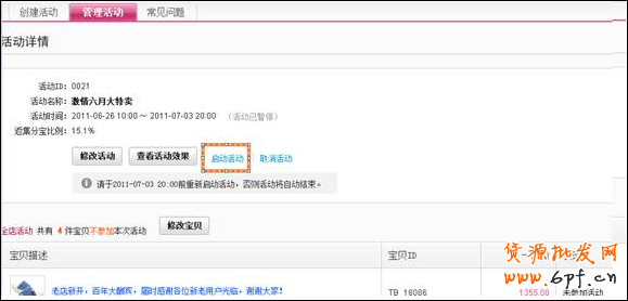 4)【暫停】可以取消,取消后進入【進行中】狀態(tài),優(yōu)惠信息在商品信息頁面重新展現(xiàn),此時買家下單,可享受優(yōu)惠。