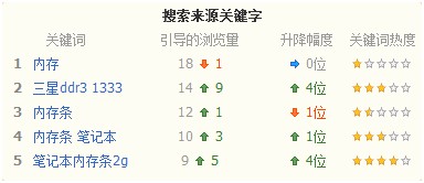 從賣家診斷助手中的數據可以看到,該店鋪中引導流量量最大的關鍵詞是“內存”,但這個關鍵詞并不是整個淘寶搜索中最熱門的關鍵詞。而“筆記本內存條2g”這個關鍵詞,在淘寶搜索中更加熱門,如果能夠優化這個關鍵詞下的寶貝在搜索的排名,那可以獲得更多的流量。另外,寶貝中產品詞堆砌的情況非常嚴重,例如,有個寶貝標題為:“金士頓 內存 DDR3 1333 4G 筆記本 內存條 三代4g 筆記本內存條”,筆記本內存條這幾個字出現了兩遍,標題不要為了填滿30個字而來填寫,要簡單易讀。