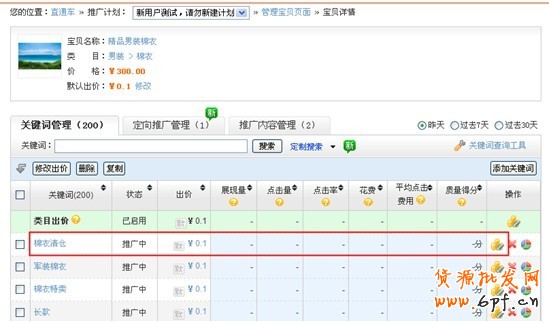 其次,若推廣計劃正常,請點擊進入寶貝詳情頁面,查看關鍵詞目前的出價和質量得分,然后查看下后臺的預測排名情況;操作圖解如下: