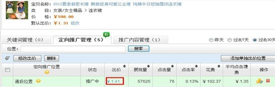 出價1.41,流量一個月才76個,說明這款寶貝的定向隱性質量得分非常低。優化定向不能只靠出價,更關鍵的是如何優化定向的質量得分。