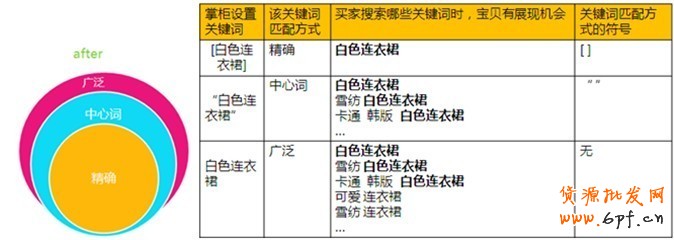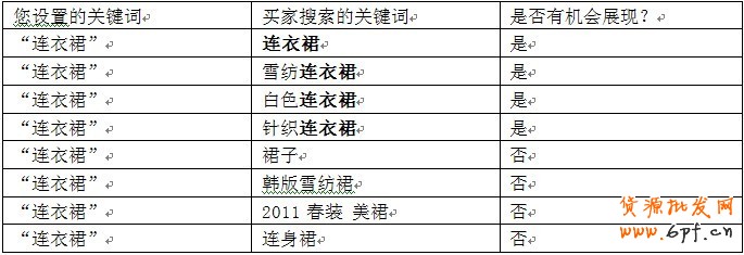 B)若您設置的關鍵詞是“連衣裙”(中心詞匹配方式)時,當買家搜索連衣裙、雪紡連衣裙、白色連衣裙、針織連衣裙,等時,因為完全包含了您設置的關鍵詞,則有展現的機會。流量較多。