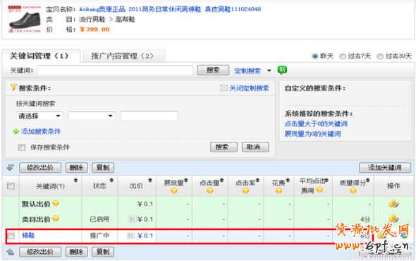 當(dāng)一款寶貝的總體點(diǎn)擊率很高,里面的所有關(guān)鍵詞質(zhì)量得分都很高。我用的方法是利用關(guān)鍵詞的點(diǎn)擊率,提升定向的質(zhì)量得分。下面看圖: