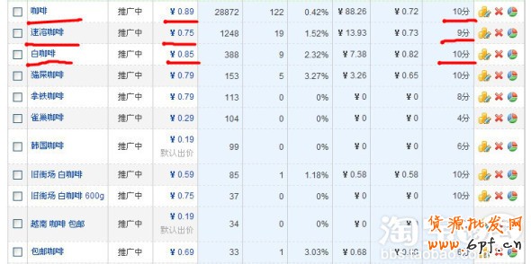 這個標題包含了“咖啡”、“速溶咖啡”、“白咖啡”這3個核心熱門關(guān)鍵詞,流行詞只有一個“千套好評”,其質(zhì)量得分分別是:10分、9分、10分(如下圖6-27),其出價分別是0.89元、0.75元、0.85元。