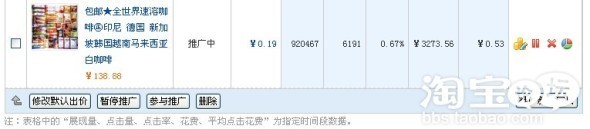從上圖可以看出,關(guān)鍵詞“咖啡”出價是“0.89元”,質(zhì)量得分是“10分”,最后平均點擊費用是“0.52元”,還是蠻劃算的吧!看看這款寶貝的推廣標題(關(guān)鍵詞)是怎么寫: