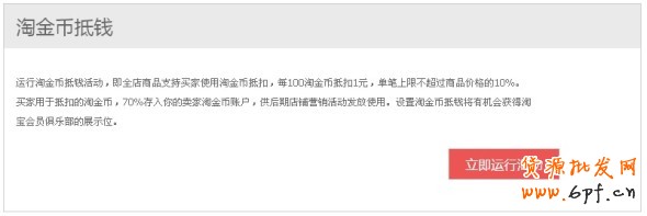 - 賺金幣:賣家設(shè)置全店商品或單品的淘金幣抵錢活動,買家購物時可用淘金幣抵現(xiàn),買家的金幣70%打入賣家淘金幣賬戶。