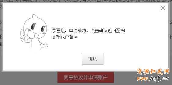 3、查看淘金幣賬戶協(xié)議,點擊【同意協(xié)議并申請賬戶】,提示申請成功,點擊【確認】