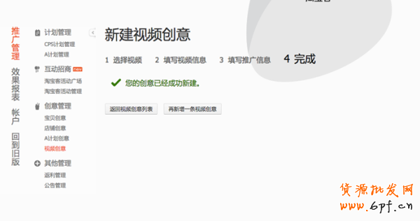 9. 新建創意視頻(完成):可選擇『再新增一條視頻創意』繼續新建視頻,或『返回視頻創意列表』管理或修改已經上傳的視頻