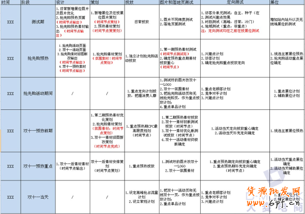 3、根據(jù)運(yùn)營(yíng)節(jié)奏來制定具體鉆石展位規(guī)劃時(shí)間節(jié)點(diǎn)工作安排規(guī)劃表格。