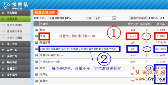 這是一家皇冠做女包的店鋪,紅色標注①關(guān)鍵詞,帶來1200多流量,但成交只有7筆,轉(zhuǎn)化率0.58% 。下面藍色框②的關(guān)鍵詞,流量不多,20個流量帶來5筆訂單,轉(zhuǎn)化率25%。你可能說,這是偶然。那么再往下看流量并不高的藍色框③轉(zhuǎn)化率,22.22%、3.66%、3.03%