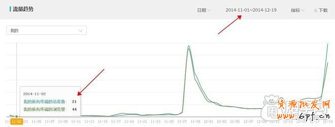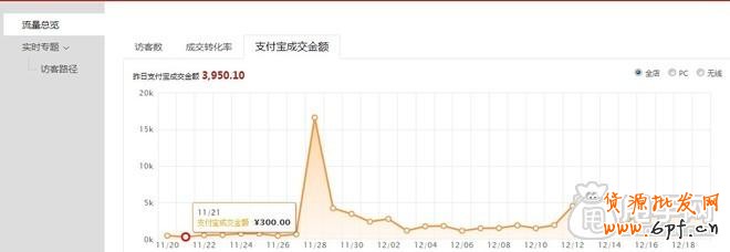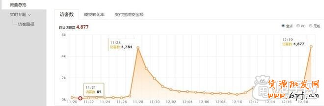 從圖2中可以看出在,自從我11月16日開始正式接手后,首先是選3款比較有潛力的寶貝進行標題優化,并且將其中一款打開打造爆款的!從11月17日流量馬上增長!(對比上面兩張圖片看得出很明顯不同)