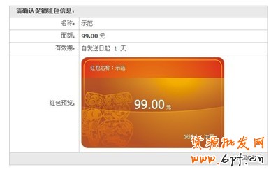 2、設置紅包:紅包名稱自己想,說明可填寫可不填寫,面額可自定,有效期,如果是刷件的話,一般都建議設置為一天,要是刷客有事沒用到紅包的話,那么紅包里的錢還是會自動返回到賣家的支付寶上的。