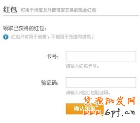 最后,再輸入賣家給你提供的卡號和密碼,然后就確認領取,這樣就可以領取成功了,當你領取成功之后,買家(刷手)就可以在拍下寶貝之后使用紅包支付了。