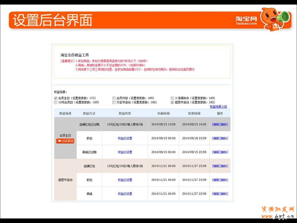 b、商家從哪里設(shè)置會(huì)員權(quán)益工具?集市商家從店鋪營(yíng)銷中心,用賣家賬號(hào)登陸,點(diǎn)擊http://siteadmin.taobao.com/activity/memberBenefits.html?spm=0.0.0.0.tSfhdj 設(shè)置。