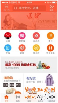 通過(guò)IPHONE 5S 進(jìn)入淘寶APP首頁(yè)是這樣的,除了頁(yè)頭橙色占比10%外,其他區(qū)域基本都以白色為主,在這個(gè)尺寸的頁(yè)面上要突顯你的素材,最簡(jiǎn)單的方法就是靠顏色。