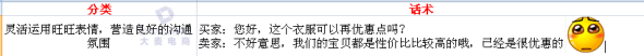 ② 售中話術:A.發票問題B. 質量問題C. 價格問題D. 尺碼問題E. 色差問題F. 快遞問題G. 發貨問題。例如: