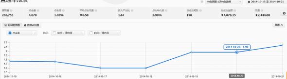 第一周主要是對店鋪的熟悉和契合度的掌控;關鍵性的轉折就在第二周,從第二周開始,也就是十一假期剛過,淘寶的買家購買力正在逐步的恢復,我們的力度也開始加大;花費開始提升,并且成交筆數也在不停的攀升;第二周的最后一天,也就是14號,我們的日成交量已經達到了51筆,這個數字比之前翻了3倍多,掌柜開始對我們有了基礎的信任,他認為我們可以把他的店做起來,因為這個時間段,我們的數據一直在提升,成交筆數開始翻翻,自然就有了更深的探討。