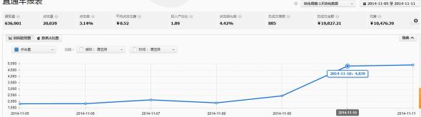 第五周的數據,剛好到雙十一當天,我們可以看到,雙十一當天的成交量自然是最高的,從這個表中我們可能看不出什么,但是從流量和花費的表上,我們卻可以看得出一些問題。