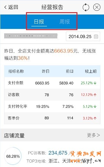 更全面的數據分析:在分析-經營報告里將會有日報和周報,對店鋪的經營狀況進行分析,包括重點指標的解讀,店鋪流量來源(包含PC端和無線端)和支付金額top商品做詳細分析。讓您能更全面的看數據和更好的了解店鋪經營狀況。