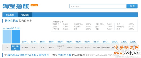 錢包類目占比達(dá)到98%,其他只有2%,因此我們可以理解為這個(gè)關(guān)鍵詞對應(yīng)的權(quán)重最高的類目是: 箱包皮具/熱銷女包/男包>錢包(這個(gè)例子沒有什么代表性,只是分享一下判斷方法)