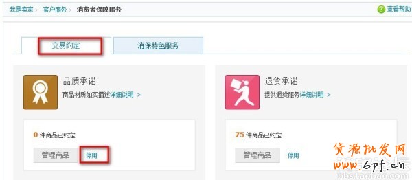 2)單個商品停用,進(jìn)入賣家中心“消費者保障”中“交易約定”在商品管理界面,選中要停用的商品選擇“未約定”即停用。
