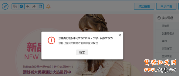 使用模板時(shí),需要將模板中的圖片、文字等內(nèi)容替換成您自己的寶貝圖片和信息,如果未對(duì)模板做任何操作的話,將無法同步到寶貝詳情,出現(xiàn)如下圖提示。