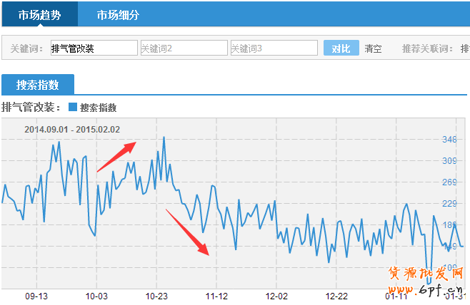 針對店鋪的五款排氣管改裝的寶貝,以【例:排氣管改裝】為關鍵詞,淘寶指數數據截圖: