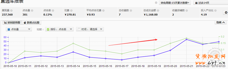 分析:從推廣14天的效果上看,roi達到了4.19。同時流量和點擊率是呈現上升趨勢,ppc較低,并保持平穩,推廣期間轉化出現高峰期,同時推廣期間幾乎每日都有一定成交,這對賬戶轉化起到一定促進作用。