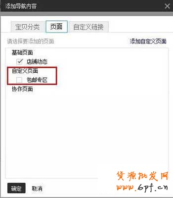 添加導航內容如下圖所示:寶貝分類、頁面、自定義鏈接。