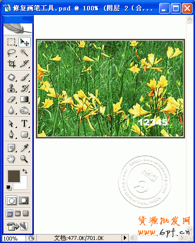 操作的方法與仿制圖章工具相似。按住Alt鍵,在無文字區域點擊相似的色彩或圖案采樣,然后在文字區域拖動鼠標復制以復蓋文字。只是修復畫筆工具與修補工具一樣,也具有自動匹配顏色的功能,可根據需要進行選用。