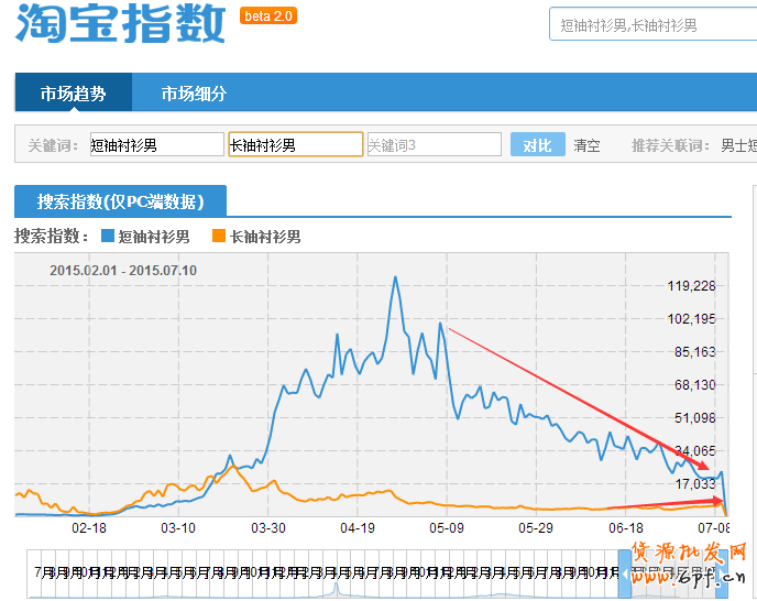 從以上淘寶指數(shù)搜索“短袖襯衫男”和“長袖襯衫男”可以發(fā)現(xiàn),“短袖襯衫男”在五月份搜索指數(shù)達到上半年的最高峰,而到了六月份以后,行業(yè)搜索指數(shù)大幅度下滑,到了七月上旬搜索指數(shù)已經(jīng)很低了,而這時候如果店鋪內(nèi)都是夏款,顯而易見,店鋪的流量整體會大幅度下滑,而“長袖襯衫男”到七月份以后搜索指數(shù)逐漸提升。