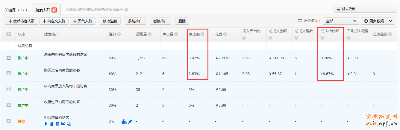 搜索人群,無論是在旺季還是淡季都非常不錯。雖然流量可能不是很多,但是點擊率和轉(zhuǎn)化率一般都高于關(guān)鍵詞搜索和定向推廣,在溢價方面剛開始可以設(shè)置50%-80%,后期根據(jù)點擊轉(zhuǎn)化情況做調(diào)整。