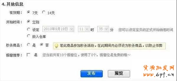 四、淘寶開店在最要的一項就是有效期,就是別人常說的商品上下架,建議選擇7天,開始時間選擇立即或按時間段,是否秒殺商品、櫥窗推薦,選擇后,點擊發布即可。