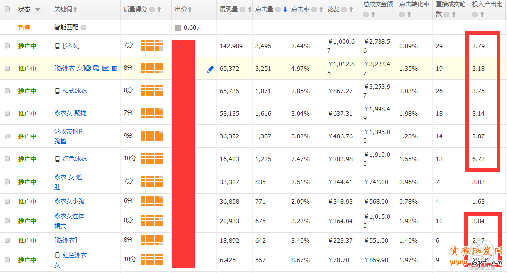 到了8月份后,尤其到后面的9月份,整體的流量開(kāi)始趨向于下滑,而泳衣有另外一個(gè)小旺季,就是在深秋冬季后,溫泉泳衣將卷土重來(lái)。而在9-10月份,就是整個(gè)泳衣的淡季,因此,在穩(wěn)定和緩期,直通車(chē)和鉆展主要以整體的轉(zhuǎn)化效果作為參考,并開(kāi)始挑選適合的寶貝,進(jìn)行“溫泉泳衣”的預(yù)熱培養(yǎng)。
