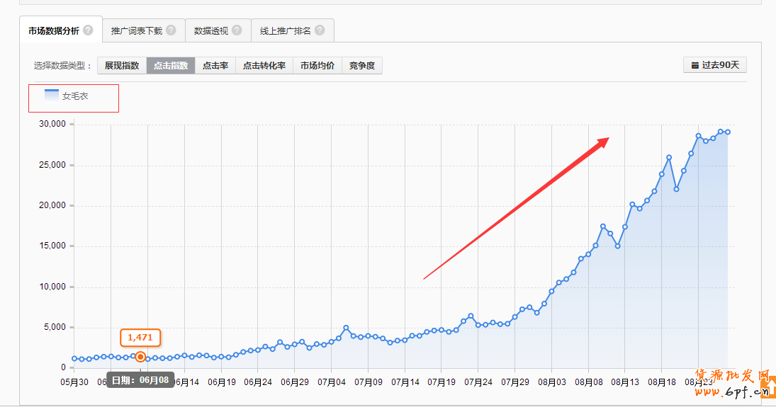 大家看到了吧,羽絨服的趨勢一直在上漲,當然了,還沒到爆發時期,那這時候的ppc肯定也不會很高。看圖。