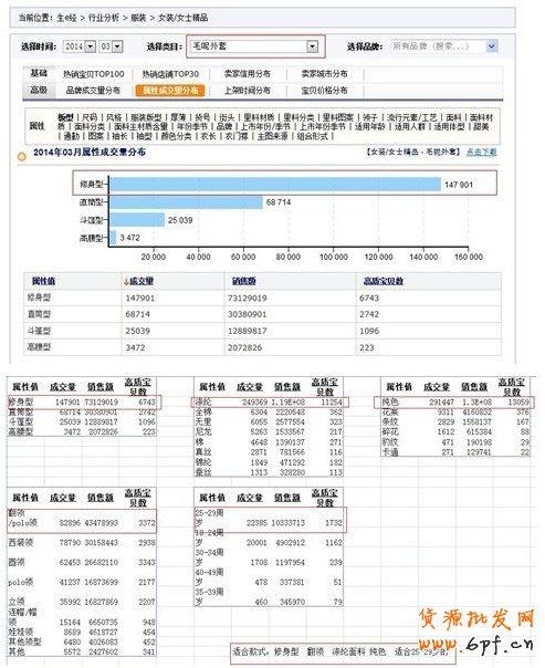 一個產品的銷量跟他的市場容量存在著很大的關系,在一個大的市場容量環境下你的銷量才能做得最好。假設你想經營的產品是女裝、毛呢外套 。首先,你要做的是去生e經選擇市場容量最大的屬性(包括:板型,面料,里料圖案,領子樣式,適宜年齡),然后,將他們的屬性值統計到一個Excel表格中,通過多方位的維度去選擇適合主推款的款式。