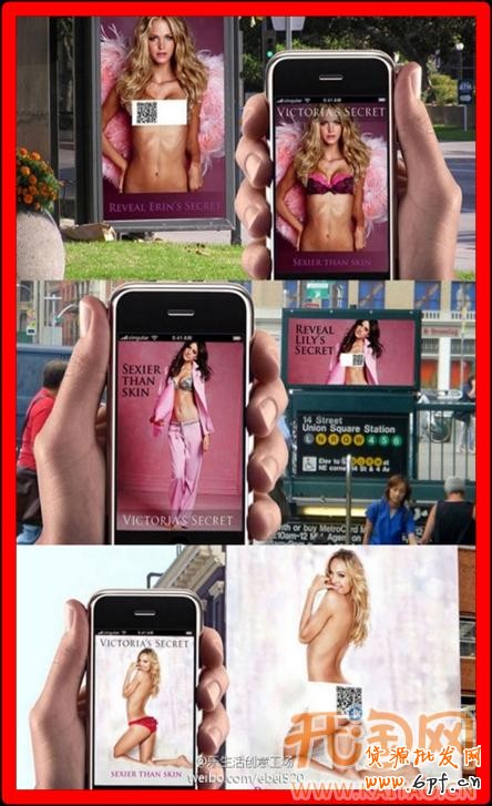 著名女性內衣品牌“維多利亞的秘密”曾做過一個二維碼的戶外廣告,非常轟動。街頭廣告的畫面中都是“維多利亞的秘密”的性感模特,關鍵部位都用二維碼擋住。被打上“馬賽克”的模特引起路人極大的興趣,拿著手機對著性感模特圖進行掃描的消費者數不勝數,他們都想一窺“馬賽克”后面藏著什么。