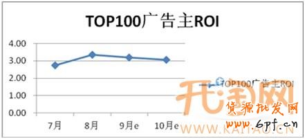 以9月份日均消耗TOP100商家作為研究樣本(占廣告主的1.6%,消耗的近40%)。通過對7~10月PV、ROI、CTR、CPC、CPM出價、消耗等的對比,TOP100廣告主日均需求PV每月平均呈20%的速度增長,日均消耗每月呈27%的速度增長。