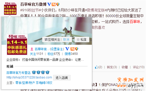 2、其次,當把鼠標放到@百草味官方微博上,會發覺彈出的名片也極具賣家特征的,直接就標注出了微博主的淘寶店名、店鋪等級和主營范圍,甚至在右下角還有直接“進入店鋪”的按鈕。這種設計徹底滿足了微博用戶想要能夠從微博端直接進入特定淘寶店鋪的期望,可以說,這個入口是沒有競品干擾的,是獨家的店鋪展現。