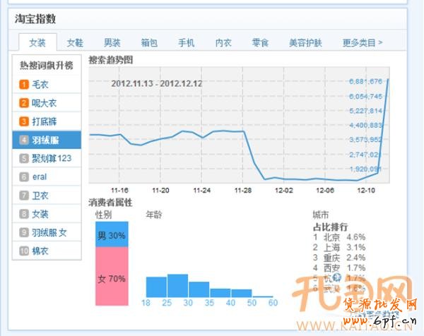 熱詞的第二個獲取來源就是賣家中心后臺的淘寶指數,這里面淘寶提供各種類目、最近搜索量比較高的熱詞。