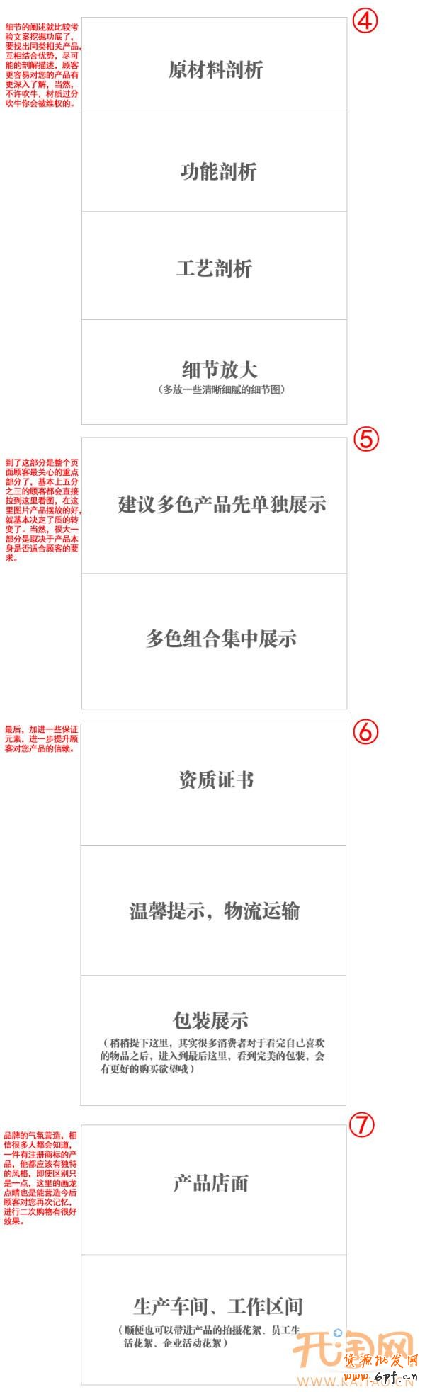 七大部分:①產品廣告大圖→②產品基本信息概括→③情景展示→④細節展示→⑤產品展示→⑥質保→⑦品牌實力