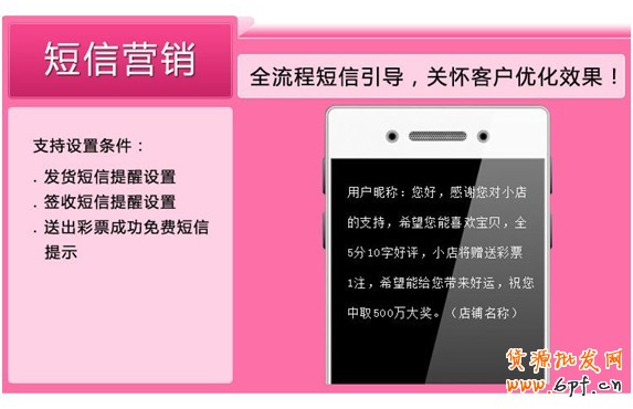 3、短信引導,設置發(fā)貨,或確認收貨或簽到后,給買家自動發(fā)送短信提示,讓買家在收到貨后,可以第一時間就了解到活動,并積極參與進來。