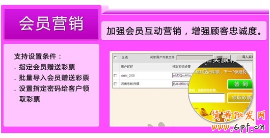 對于店鋪的客戶,我們可以利用CRM將他(她)們進行分類,對特別客戶,像VIP會員,送出特別待遇。如,給客戶分配一個特權領取密碼,在發(fā)貨時,以發(fā)貨卡,或者其它形式,將密碼告訴客戶,并告之憑此密碼進入店鋪可以領取一張彩票,此項優(yōu)惠只有特權者才擁有,這樣不但給顧客增加一分榮譽感,同時也增加了購物的趣味性和客戶粘性。